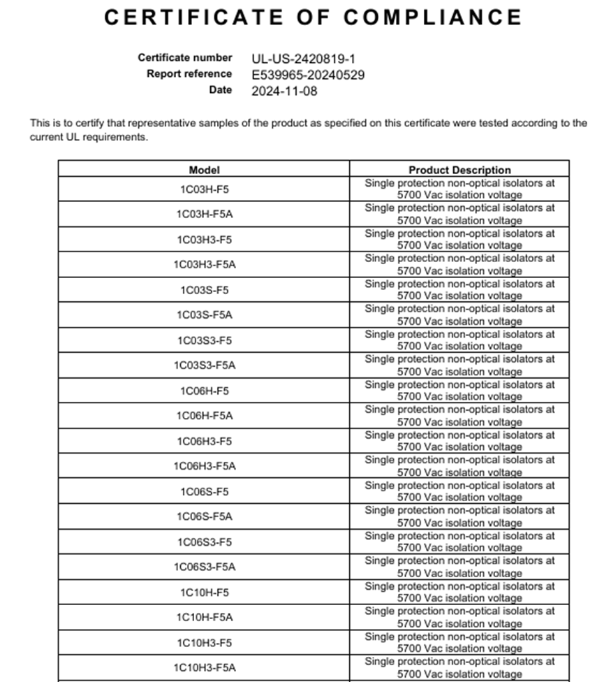 巨风半导体隔离驱动1C-F5系列顺利通过UL1577:2023标准规定的各项测试,符合VISO=5700V的要求规范,获得UL公司依据标准颁发的UL1577认证证书(File No. E539965)。